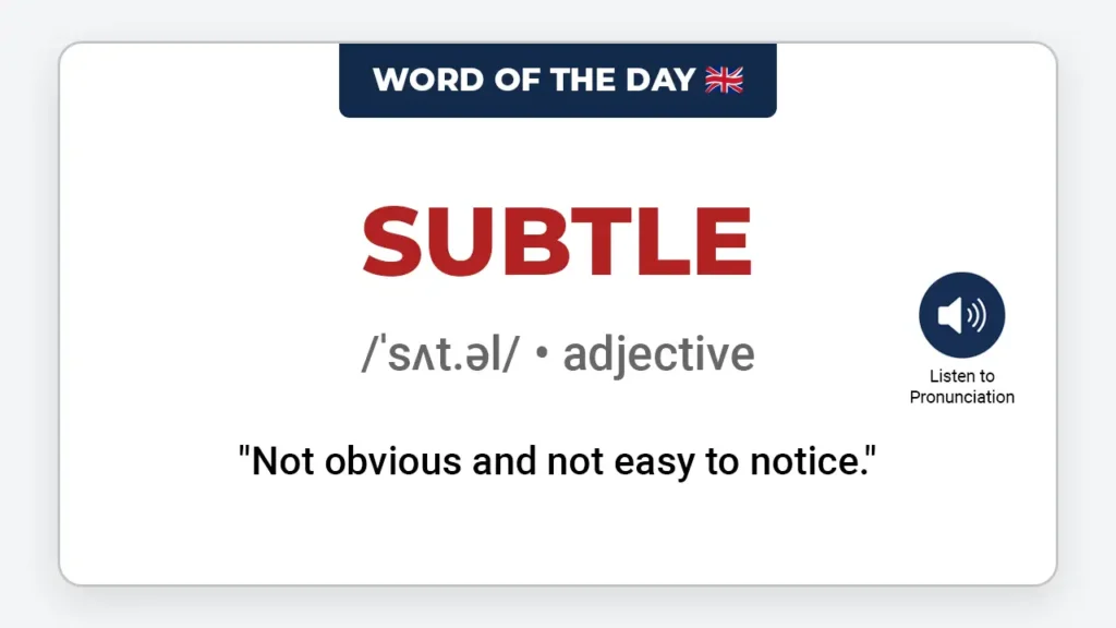 Todayโ€™s Word of the Day is Subtle. In this lesson, youโ€™ll learn its pronunciation, meaning, and how to use it in daily conversations.